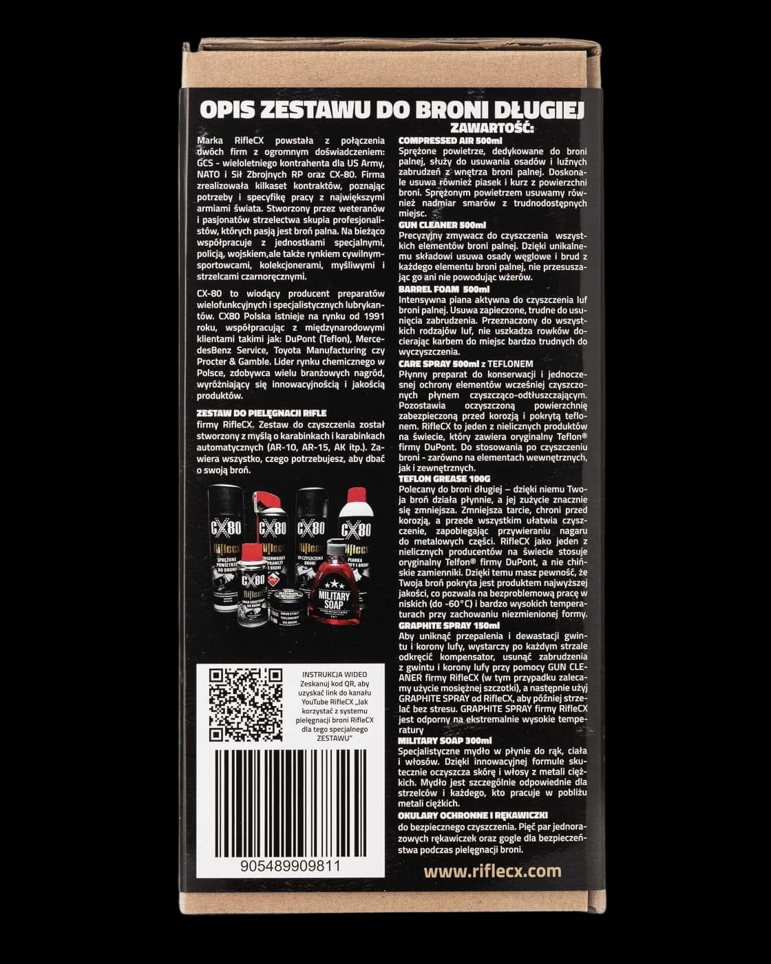 Kupując zestaw do broni długiej Riflecx- Gun Care System otrzymujesz wszystko co niezbędne aby właściwie zadbać o Twoją broń. Z tyłu pudełka znajdziesz opis preparatów a z boku kod QR, który poprowadzi Cię do filmów instruktażowych Riflecx na YouTube, gdzie krok po kroku pokażemy Ci jak stosować nasz system.
